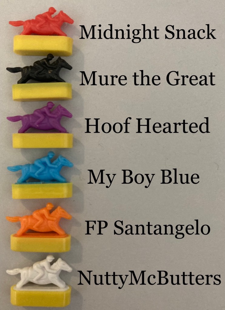 After yesterday’s controversial finish, we were just hoping for a fun, enjoyable day at the track. Lucky for us, the horses delivered! Lucky for you, I decided to add an extra race to the season for your viewing pleasure! That means there’s still 3 races to go before we crown our champion! Also, I’ve added this fancy new graphic at the top of the videos so you fans can know exactly who you’re cheering for: