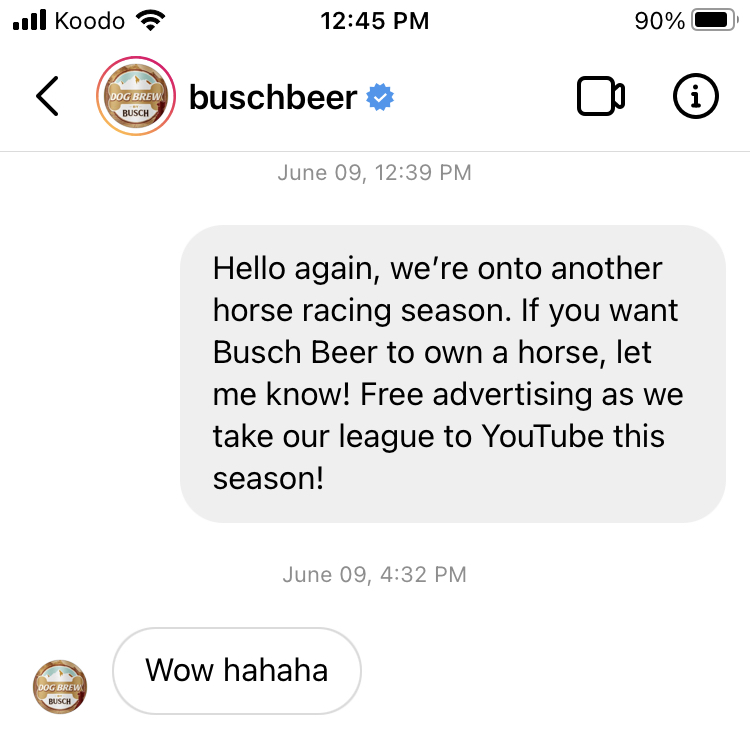 It was hard to say whether the “Wow hahaha” was there way of saying “this is the dumbest idea ever” or maybe more like “this is absolutely beautiful and hilarious”. As Busch is the type of beer I’ve liked to drink throughout my years, especially when enjoying cottage life, I chose to believe that they thought my little Horse Racing League was great and that the reason they didn’t reply again was because they are super busy but they really believe that the league could be the future of horse racing. Right?
